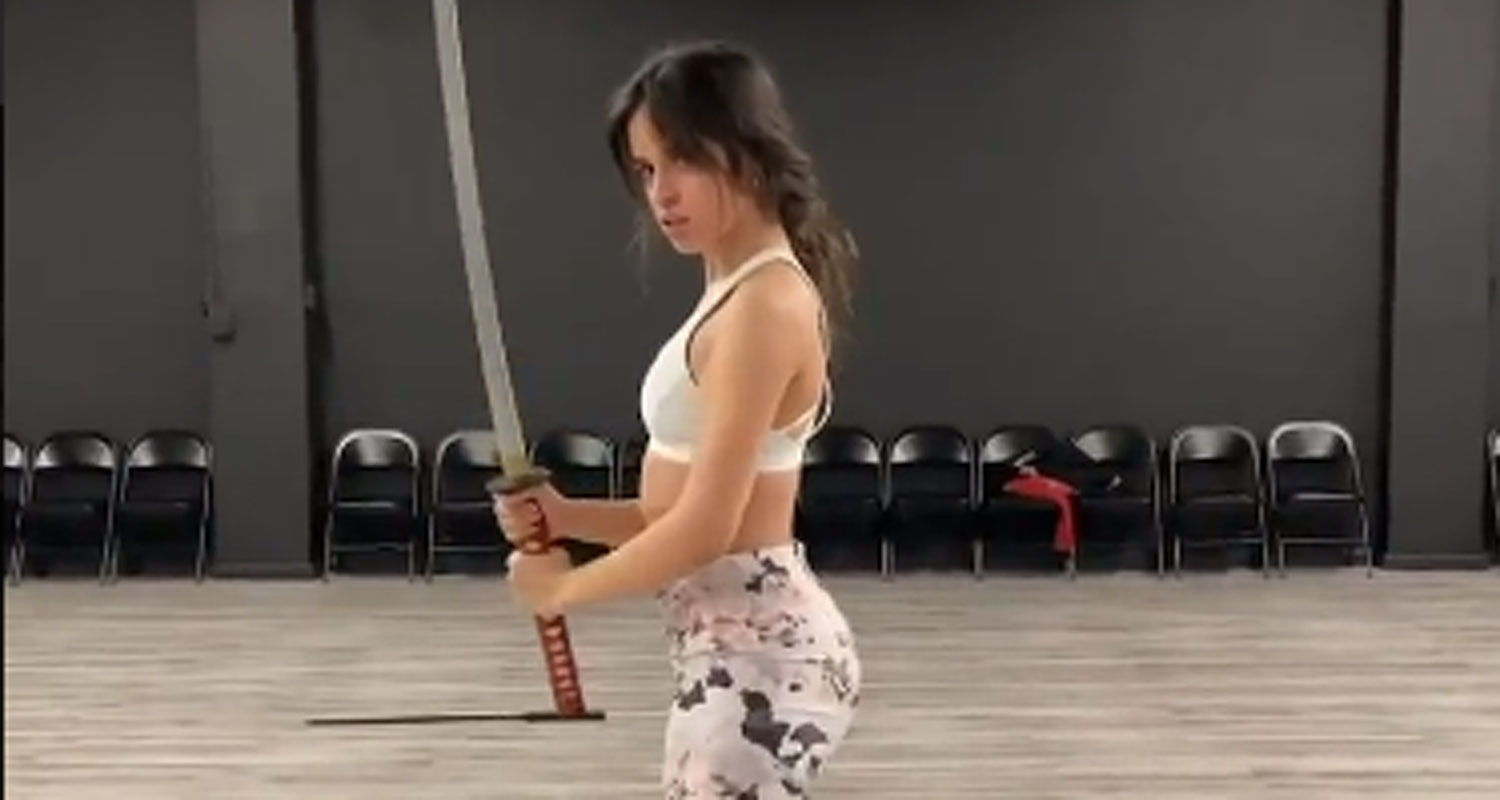 In the vid, Camila uses the sword to fight off things like anxiety, emotional eating and an existential crisis.
