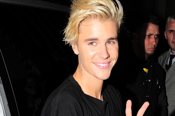 Justin Bieber flashes a peace sign as he arrives at his hotel in London, England on Wednesday night (October 21).
