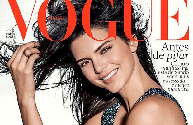 Kendall Jenner pulls her hair back from her face on the new cover of Vogue Brasil.