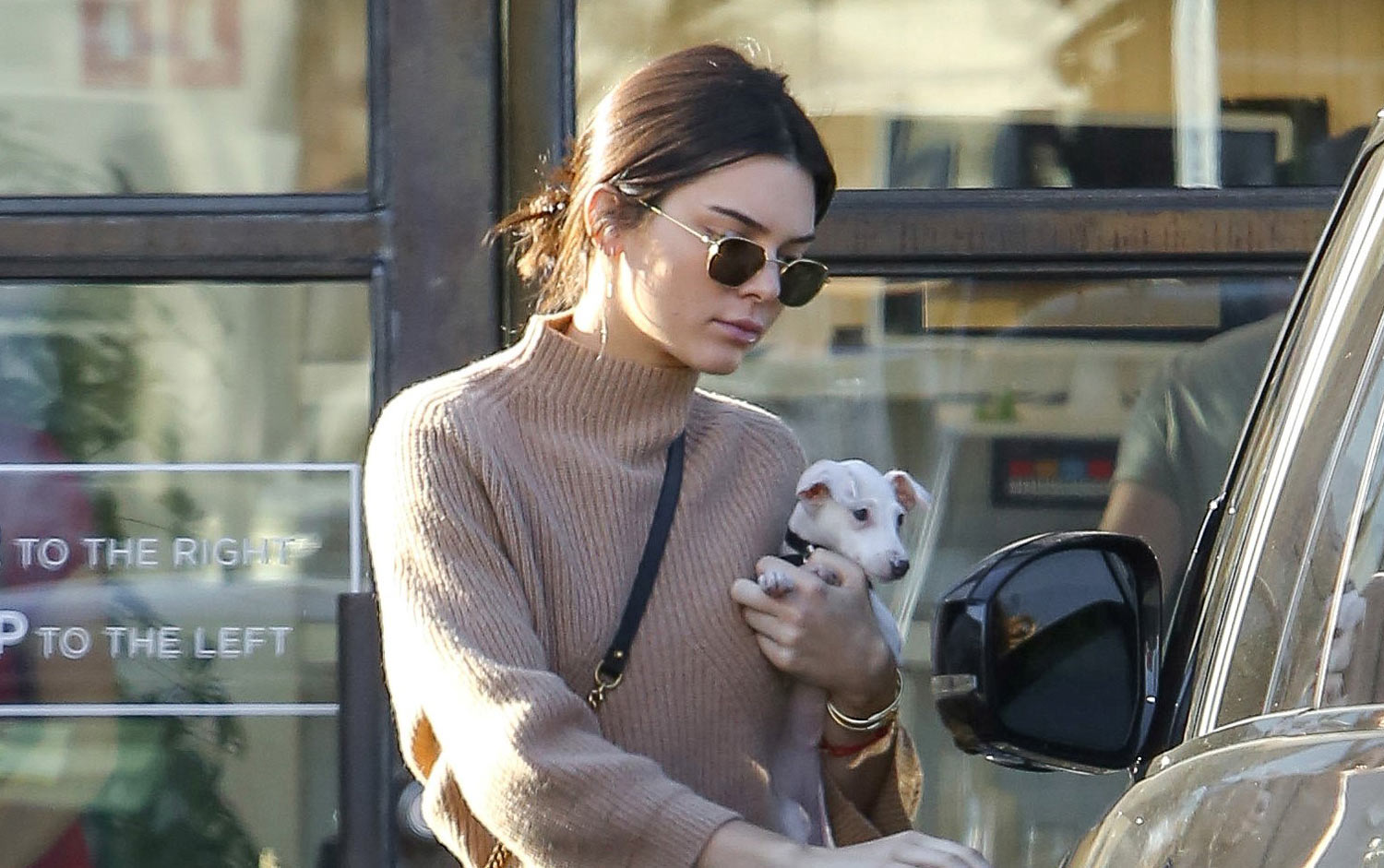 The 21-year-old model rocked a beige turtleneck and booties as she carried her adorable, little pup into the restaurant!