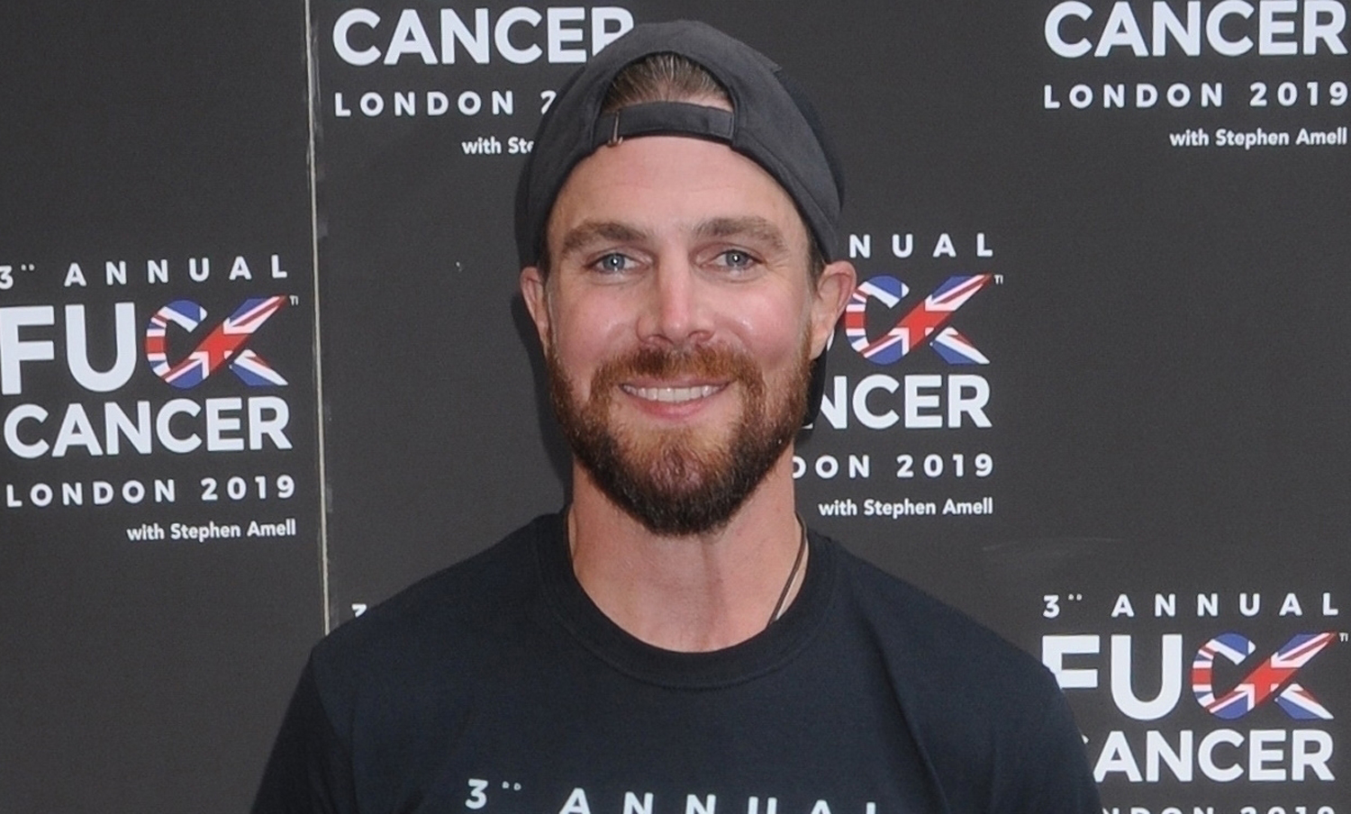 The 38-year-old Arrow star sported an “F–k Cancer” T-shirt and backwards baseball hat as he and his wife stepped out for the event, which they hosted.