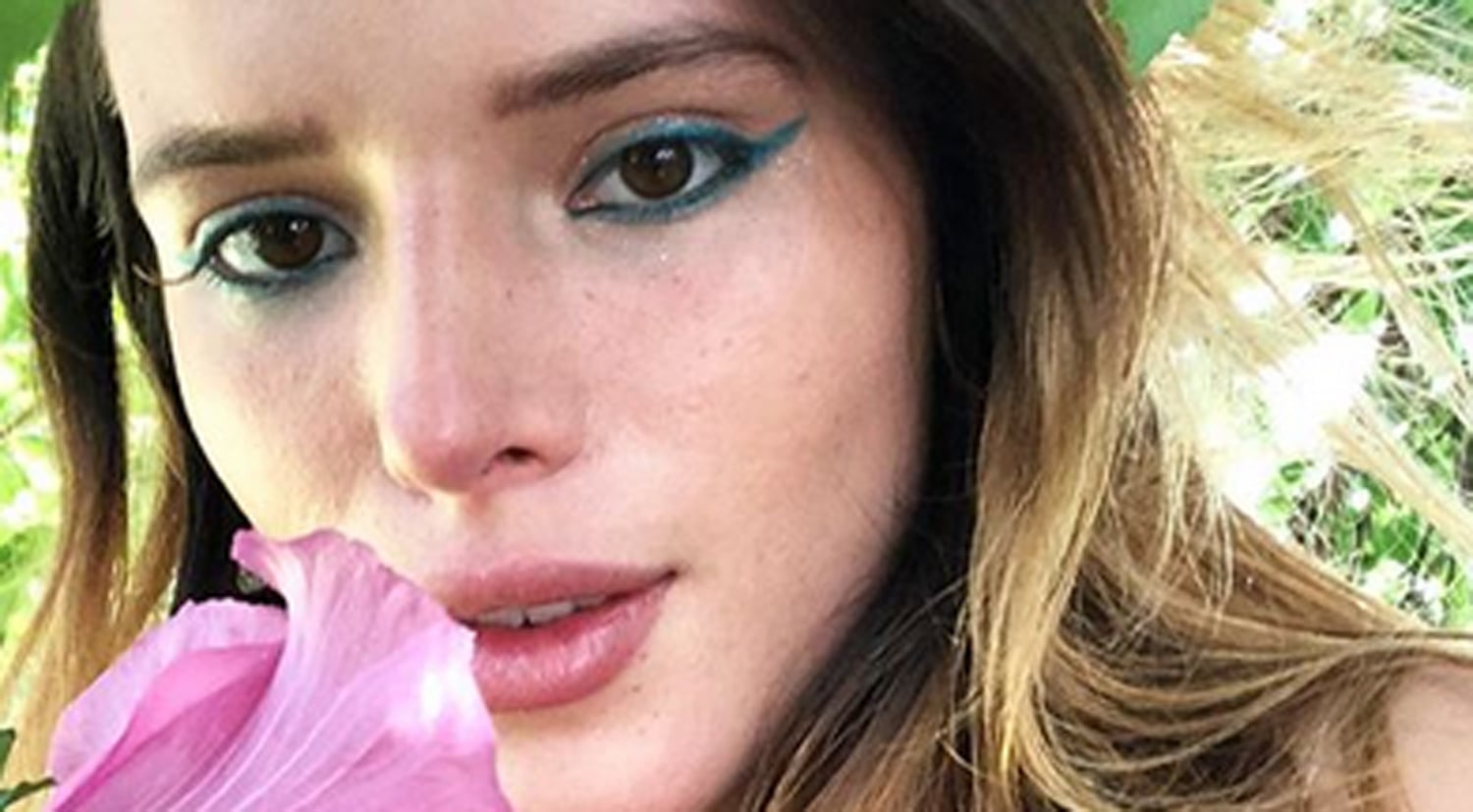 The photos feature Bella Thorne in a pink top and glittery blue eye makeup as she poses outside with a pink flower in Santa Monica, Calif.