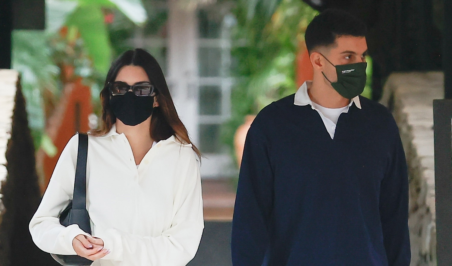 Kendall wore a white shirt, blue jeans, and a black face mask while grabbing an early dinner with Fai at the Bel Air Hotel.