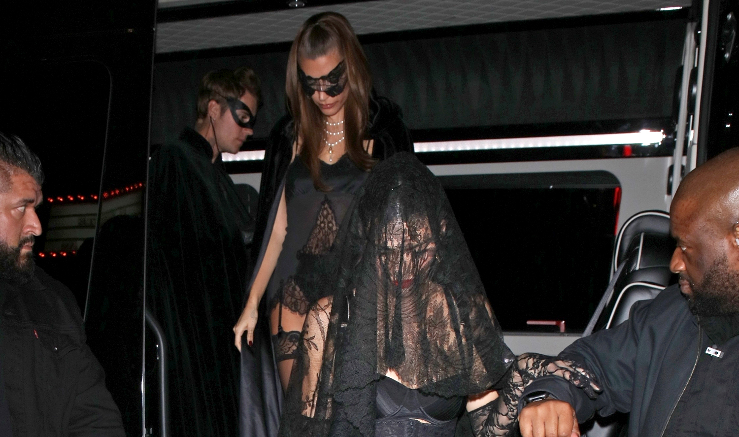FYI: Hailey Bieber and Justine Skye wore Victoria’s Secret teddies. Kendall Jenner is wearing Calzedonia tights.