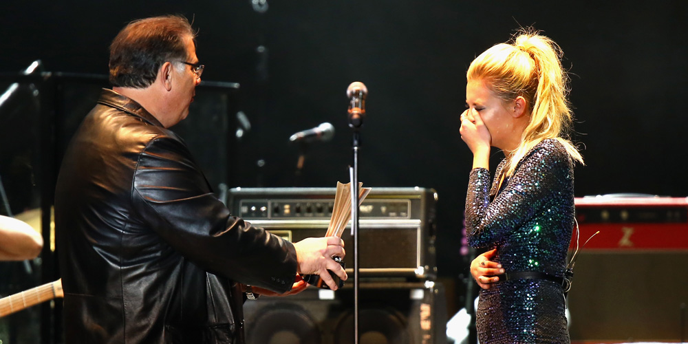 Kelsea Ballerini glitters in a blue romper on stage during the 2016 ACM Party for a Cause Festival ahead of…