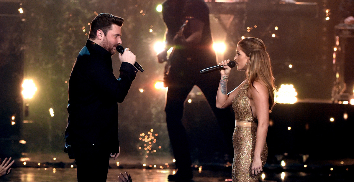 Cassadee Pope sparkles on stage next to her duet partner Chris Young at the 2016 Academy of Country Music Awards…