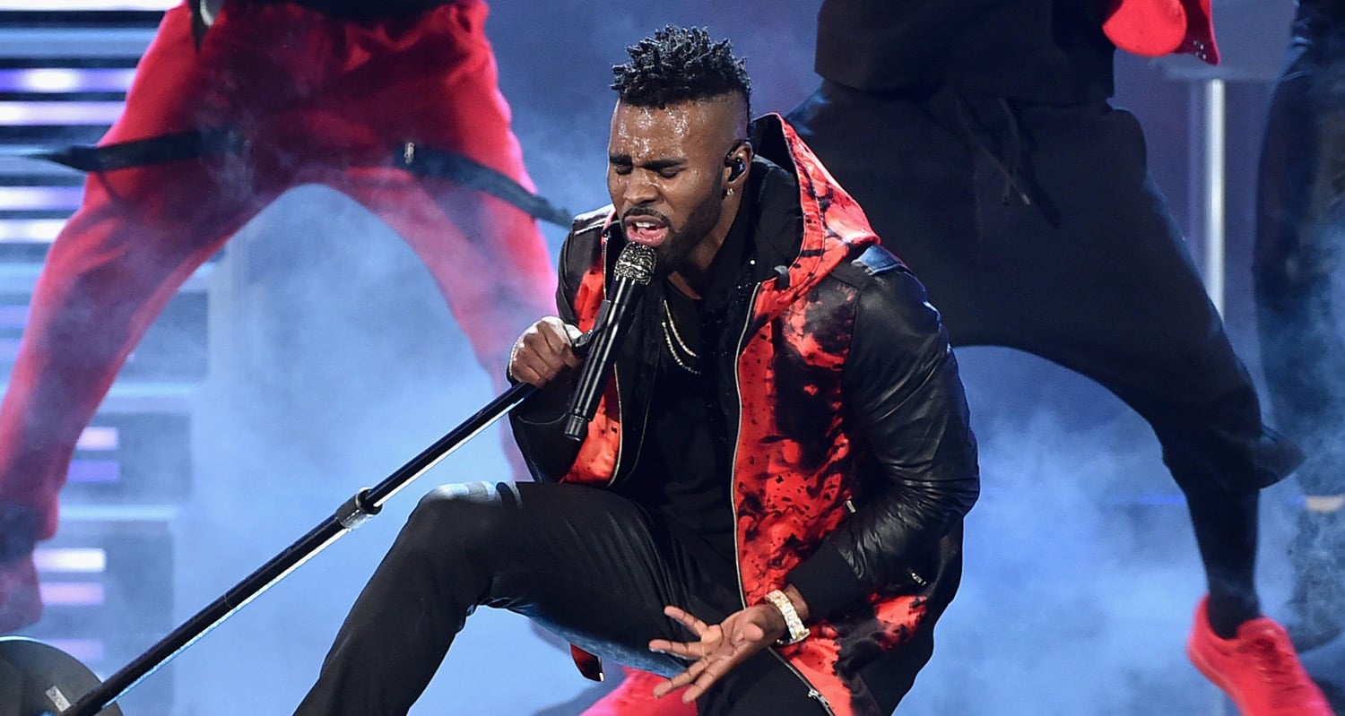 Jason Derulo kneels down with his microphone while singing to the crowd at the 2016 People’s Choice Awards held at…