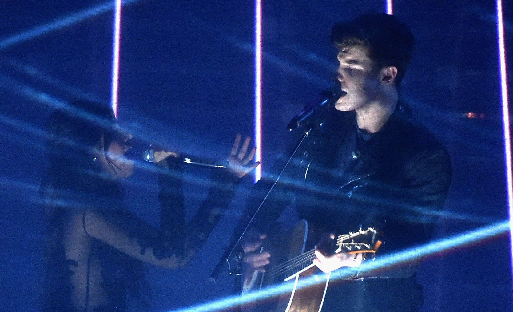 Shawn Mendes belts out on stage during his rainy performance at the 2016 People’s Choice Awards held at the Microsoft…