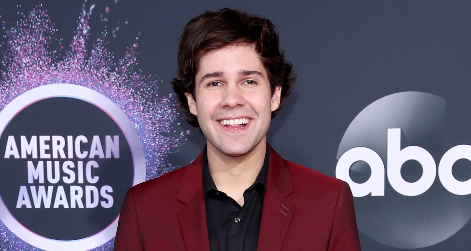 David Dobrik suits up in maroon while hitting the carpet at the 2019 American Music Awards held at Microsoft Theatre…