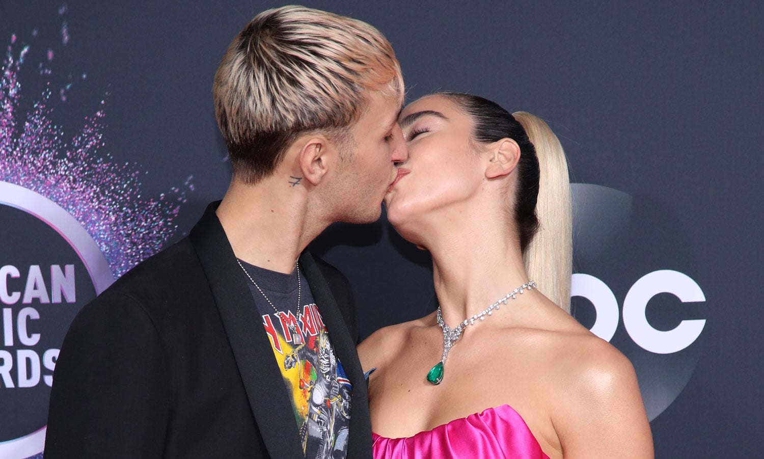 Dua Lipa shares a kiss with her boyfriend Anwar Hadid while making their red carpet entrance at the 2019 American…
