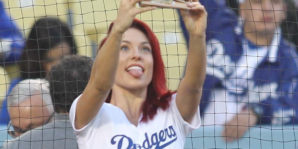 Sharna Burgess sticks out her tongue while taking a fun selfie on the field at Dodgers Stadium in Los Angeles…