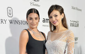 Lea Michele poses for pictures with Victoria Justice as they arrive at amfAR’s Inspiration Gala on Thursday night (October 27)…