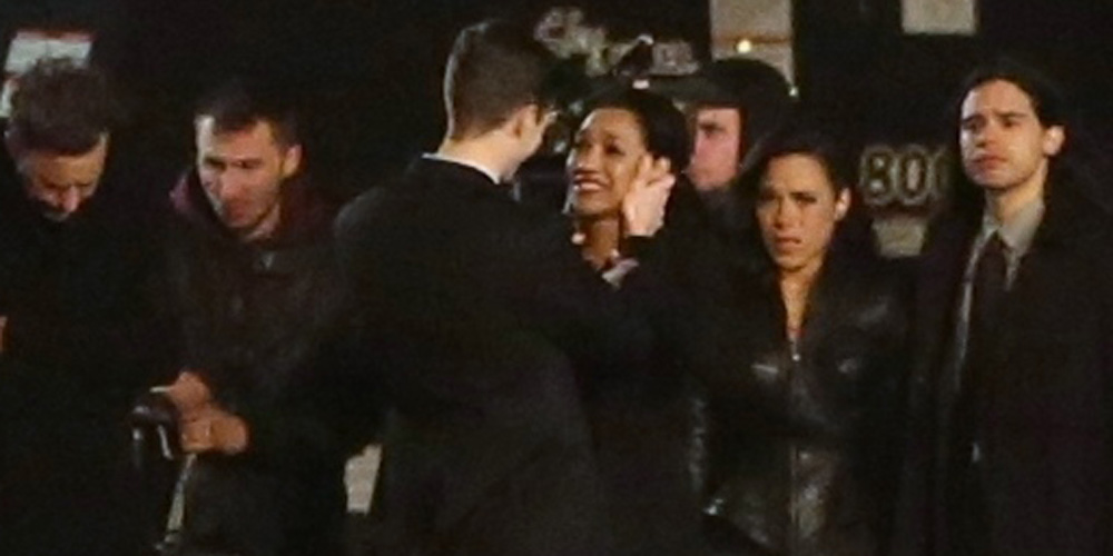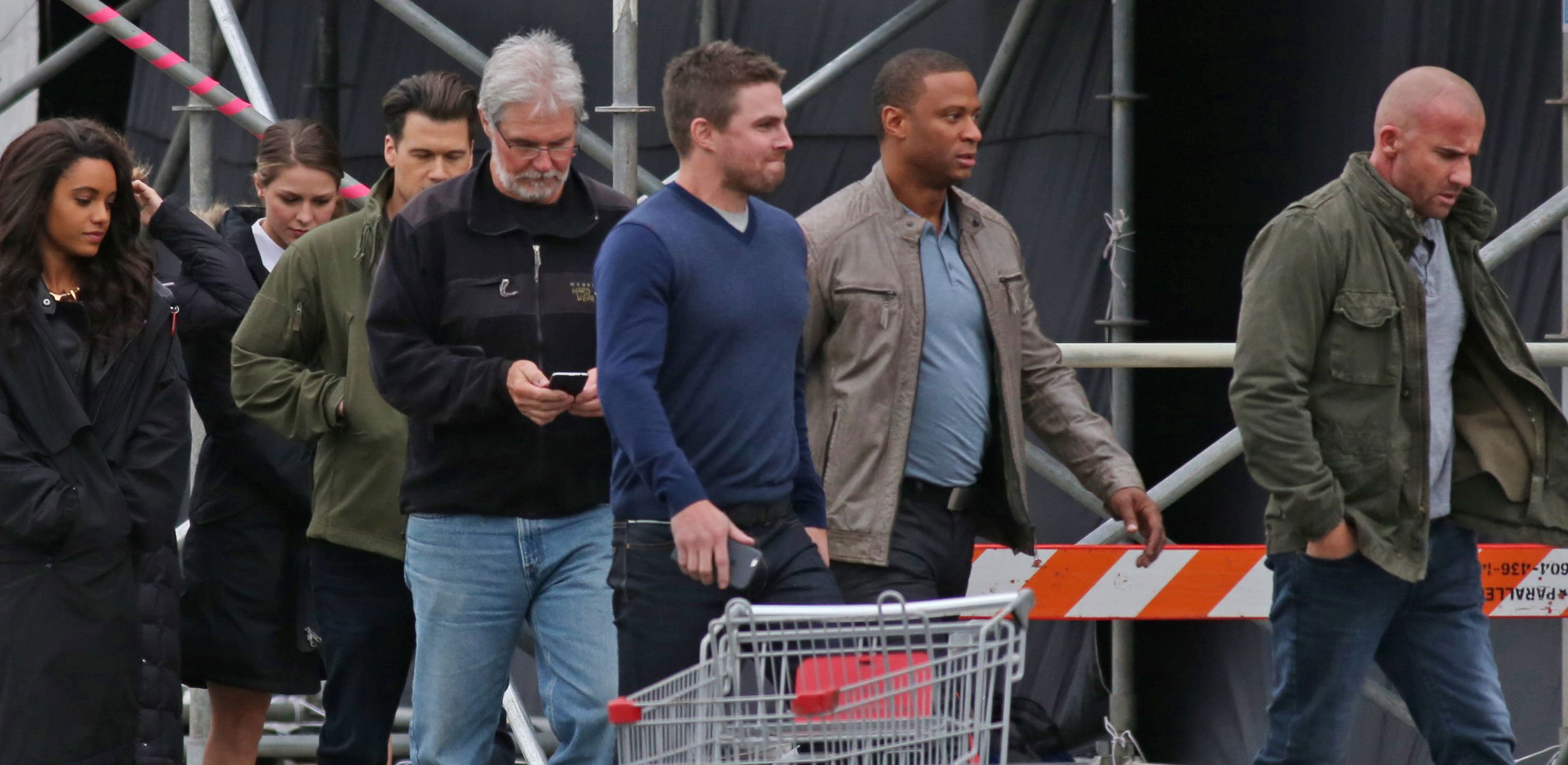 Grant Gustin, Melissa Benoist, and Stephen Amell all walk to set to kick off filming for the upcoming DC crossover…
