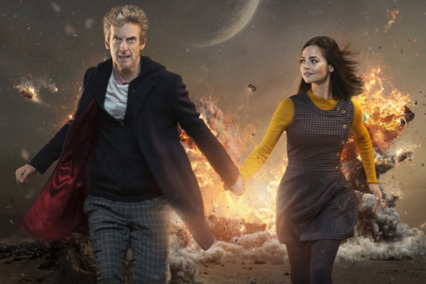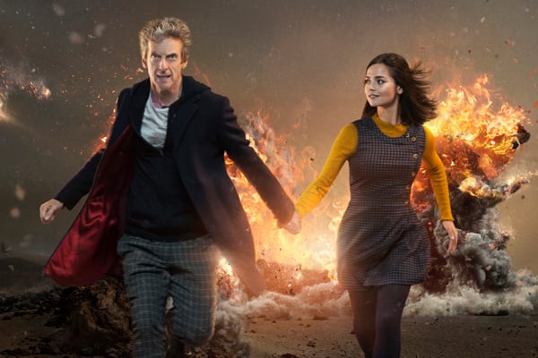 Clara (Jenna Coleman) holds onto the Doctor’s (Peter Capaldi) hand as they run away from an explosion in this new…