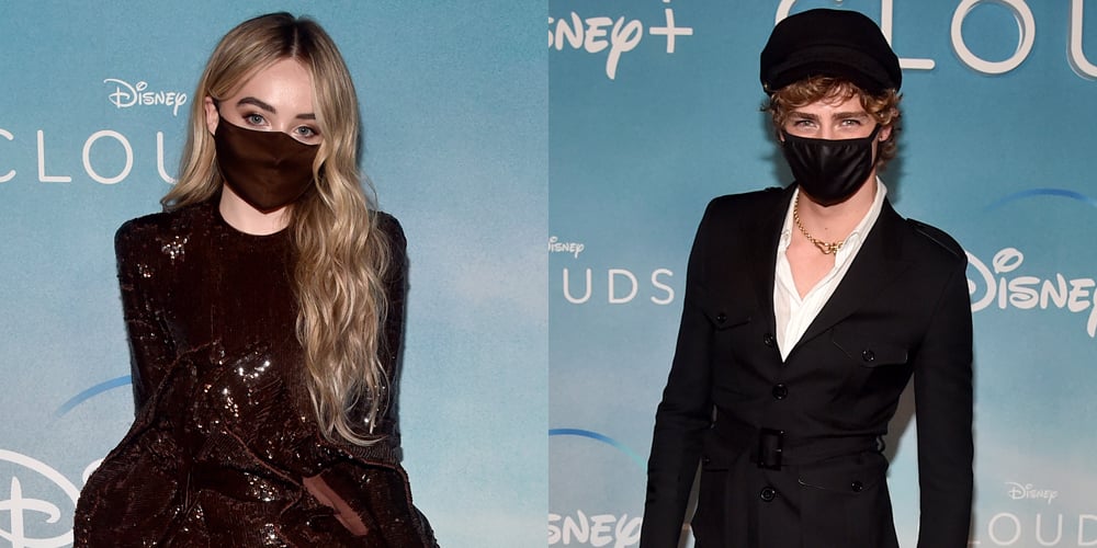 Sabrina Carpenter matches her mask to her dress while walking the red carpet for the Clouds drive-in premiere on Monday…