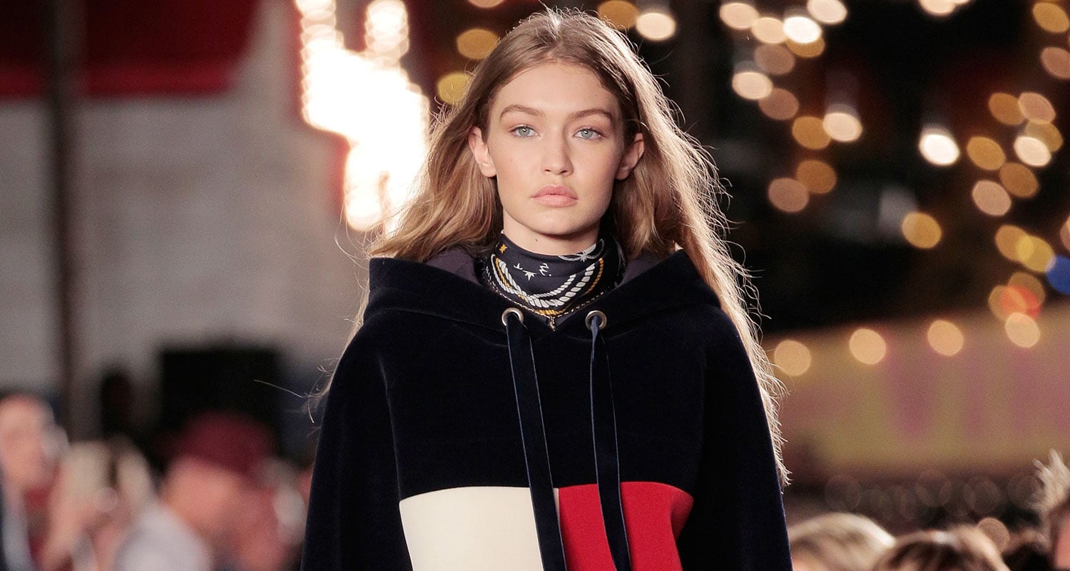 Gigi Hadid looks fierce as she walks down the runway at the fashion show for her TommyxGigi collection held during…
