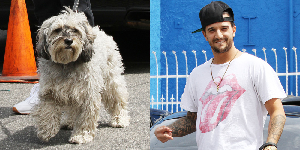 Mark Ballas walks his cutie pie pooch, Hendrix, around the dance studio during some downtime from practice with Paige VanZant…