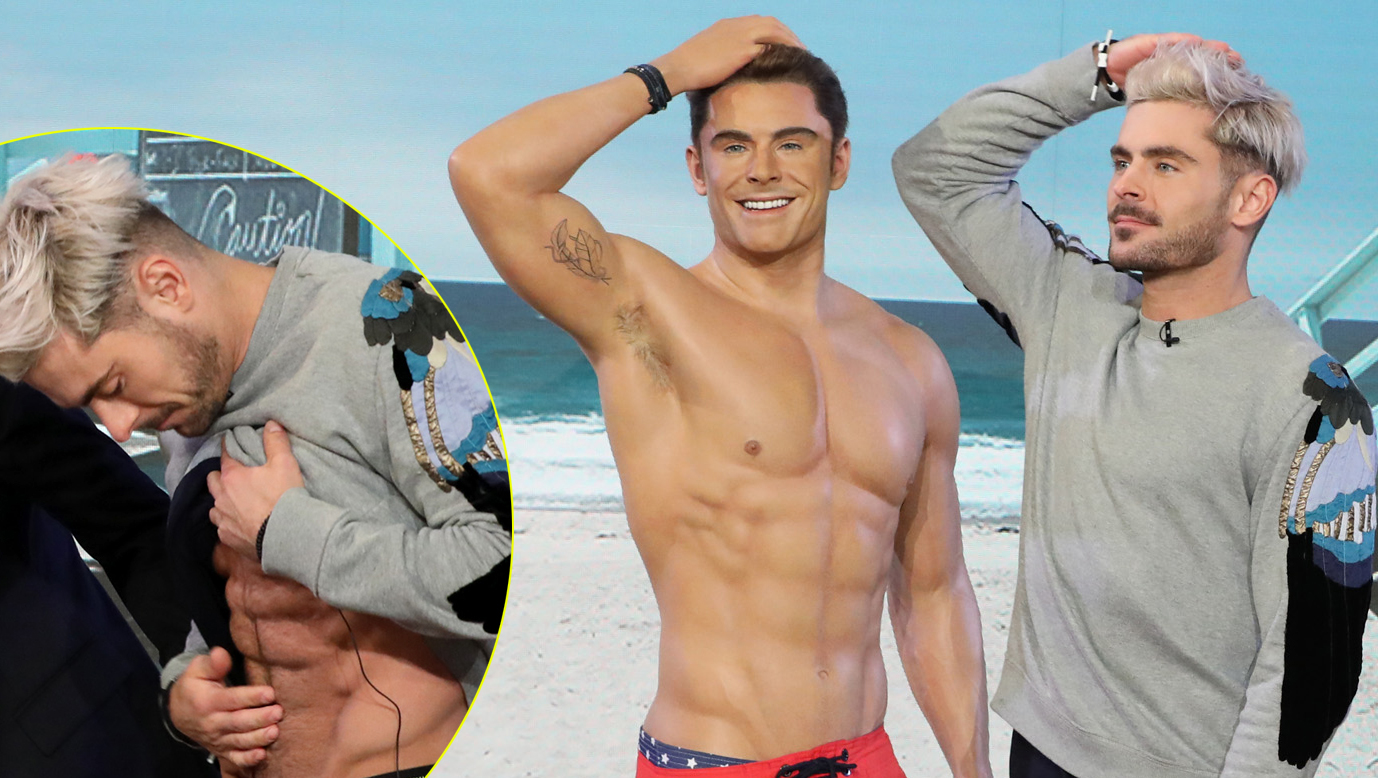 Zac Efron strikes a pose next to his shirtless wax figure, modeled after his Baywatch character, during an appearance on The Ellen DeGeneres Show, airing on Tuesday (April 30).