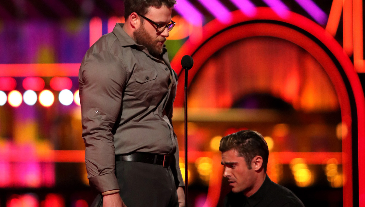Zac Efron gives Seth Rogen a big apology while on stage at the 2016 MTV Movie Awards held at Warner…