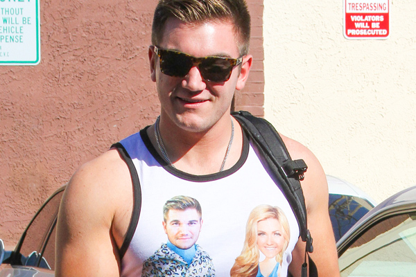 Alek Skarlatos wears his fun and custom Team Takedown tank to practice with Lindsay Arnold in Los Angeles on Wednesday…