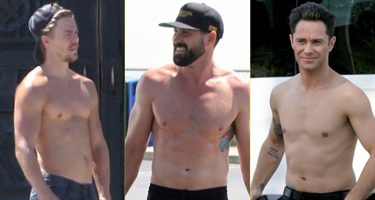 Derek Hough goes shirtless while on the set of a promo video for Dancing With the Stars on Monday (August…